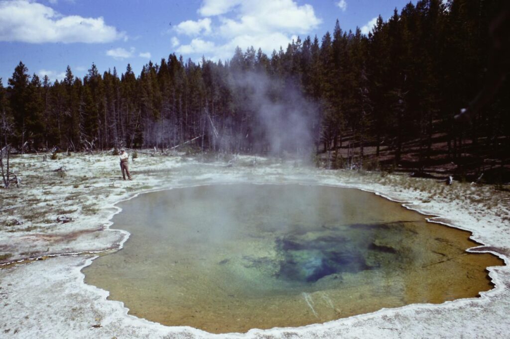 In the summer of 1966 while living in a cabin on the edge of the park, Freeze made daily treks to collect water samples, then return to the lab to scrutinize their contents for microscopic life. From a sample taken from Mushroom Spring, Freeze discovered yellowish microbes thriving in water that was 160 degrees F.